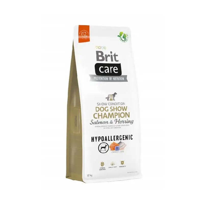 Polecaną karmą z rybą dla psów jest również Brit Care Dog Show Champion. Jest to wysokiej jakości pożywienie z hipoalergicznym składem, które zostało stworzone szczególnie z myślą o psach wystawowych. Dzięki dużej zawartośći ryb oraz obecności nienasyconych kwasów tłuszczowych, karma dostarcza wszystkich potrzebnych składników do zachowania doskonałej kondycji ciała, jak i sierści u psa. W składzie znajduje się 36% łososia, 14% śledzia. W formie wypełniacza zastosowano ryż – co można zaliczyć do wad. Co więcej, w składzie znajduje się siemię lniane, suszone wytłoki z jabłek. Świetnym dodatkiem jest olej z łososia, który dostarcza potrzebnych kwasów EPA i DHA, które poprawiają kondycję i jakość sierści u psów. Na dodatek mają pozytywny wpływ na funkcjonowanie mózgu i całego układu nerwowego. Kolejnym plusem tej karmy z rybą dla psów jest obecność drożdży piwnych, które pozytywnie wpływają na cały organizm. Warto wspomnieć, że wspomniane drożdże browarnicze dostarczają witamin z grupy B, jak również beta-glukanu, który wspiera układ odpornościowy. Co więcej, producent uzupełnił skład tej karmy o algi, które dostarczają potrzebnego jodu, który wpływa na działanie tarczycy. Z kolei jej poprawne funkcjonowanie wywiera duży wpływ na cały układ hormonalny. Warto podkreślić, że karma rybna Brit Care Dog Show Champion posiada w swoim składzie glukozaminę i siarczan chondroityny, które wspierają funkcjonowanie stawów u psów. Stosunek wapnia do fosforu w tej suchej karmie dla psów z rybą wynosi 1,22:1. Tymczasem wartość kaloryczna oscyluje w granicach 3830 kcal/kg.