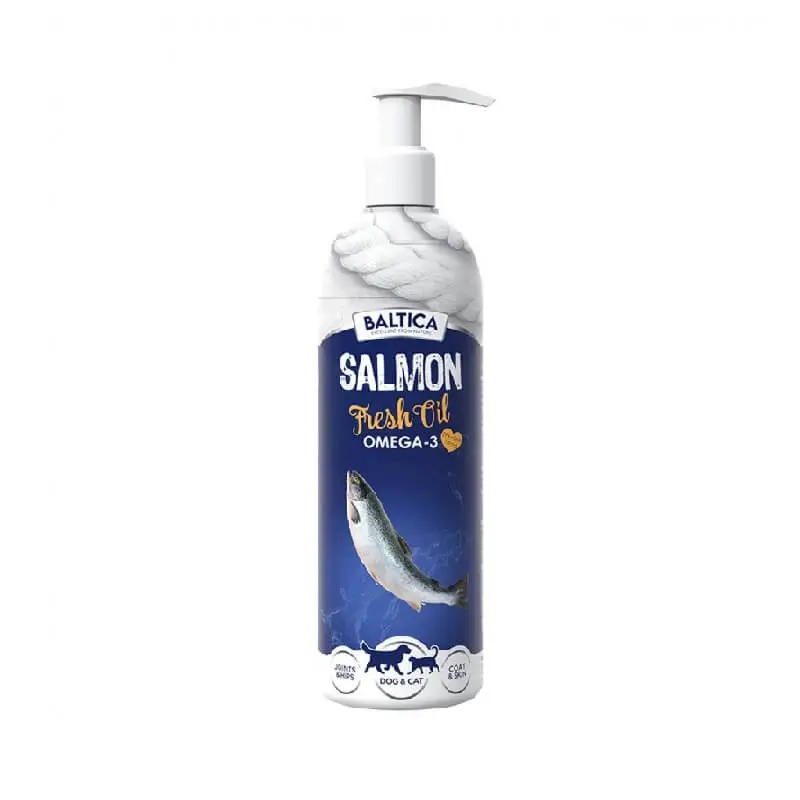 Do najlepszych olejów z łososia na styczeń 2026 dołącza ten marki Baltica. Produkt dostępny jest w 4 wielkościach do wyboru – 200, 400, 1000 lub 2000 ml. Warto wspomnieć, że jest to produkt wysokiej jakości, pozyskiwany z łososia atlantydzkiego. W składzie znajdziemy oczywiście kwasy Omega-3, jak również kwasy EPA i DHA. Warto podkreślić, że olej z łososia Baltica doskonale wpływa na jakość sierści, usprawnia funkcjonowanie mózgu, przyspiesza proces uczenia się, jak również wpływa na cały układ nerwowy. Poza tym bezpośrednio oddziałuje na układ odpornościowy, a dodatkowo jest polecany zwłaszcza dla psów z alergią skórną. Wykazuje działanie przeciwzapalne. Pozytywnie wpływa na cały organizm psa, jak i szczeniaka. Warto wspomnieć o recepturze tego oleju z łososia. W składzie znajduje się 99 g tłuszczów w formie surowej. Oczywiście olej z łososia dla psów Baltica posiada NNKT Omega-3 w ilości 26,9 g na 100 g oleju. Tymczasem łączna dawka kwasów EPA i DHA wynosi 19 g/100 g. Na zakończenie warto dodać, że produkt został zamknięty w wysokiej jakości opakowaniu, który wykonany został z najbezpieczniejszego plastiku HDPE. Poza tym producent wyposażył butelkę w pompkę, co ułatwia dozowanie oleju do pożywienia.