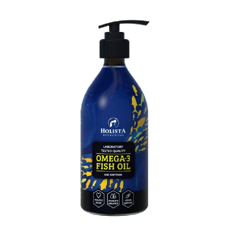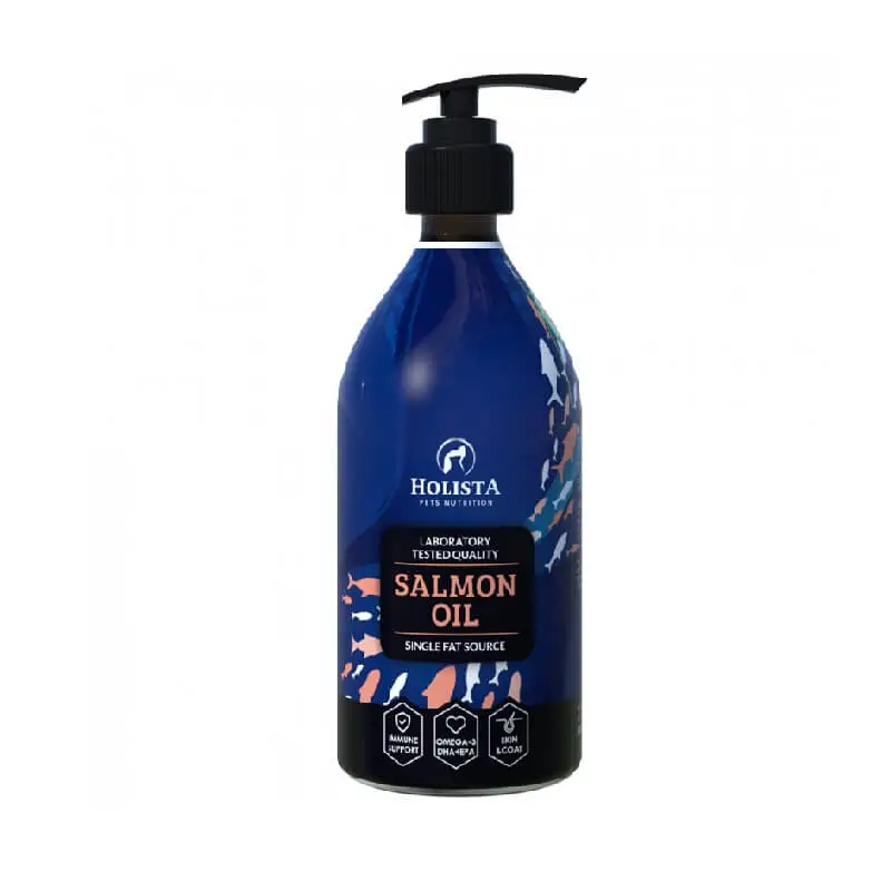 W naszym zestawieniu nie mogło zabraknąć topowego oleju rybnego Holista Omega-3, który został zamknięty w ciemnym opakowaniu. Jest to certyfikowany olej wykonany z dziko żyjących ryb morskich. Mimo że nie jest zaliczany do klasycznych olejów z łososia, to wyróżnia się bogactwem kwasów Omega-3. Do wyprodukowania oleju użyto ryb Sardelowatych, Śledziowatych, Ostrobokowatych, Makrelowatych. Produkt wyróżnia się wysoką zawartością kwasów Omega 3 w składzie. Poza tym jest wolny od wszelkich sztucznych konserwantów, barwników i innych substancji wspomagających. Ma bardzo ładny kolor. Wykazuje działanie wspierające układ odpornościowy, kostny, stawowy, krążeniowy. Co więcej, regularnie podawany przyczynia się do pięknej i błyszczącej sierści. Zawartość EPA w składzie oleju Holista Omega-3 wynosi 17,8 g/100 g produktu, DHA to 11,2 g/100 g oleju, z kolei zawartość Omega-3 wynosi 35,6 g na 100 g. Na zakończenie warto wspomnieć o witaminie A, której obecność w recepturze oleju Holista wynosi mniej niż 10 μg/100 g, jak również witaminy D – w tym przypadku jej zawartość to 0,85 μg/100 g. Produkt wyposażony w wygodną pompkę do dozowania.