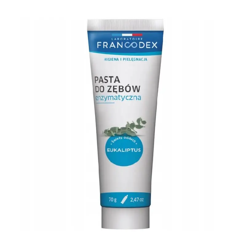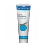 Najlepszą pastą w rankingu na październik 2025 zostaje Francodex. Warto dodać, że jest to enzymatyczna pasta do pielęgnacji uzębienia u psa. Dzięki zawartości naturalnych enzymów, prezentowana pasta rozpuszcza i usuwa wszelkie pozostałości po jedzeniu. Dodatkowo odświeża oddech oraz zabezpiecza zęby psa przed powstawaniem płytki nazębnej i kamienia. W składzie oprócz enzymów znajduje się wyciąg z granatu, jak również węglan wapnia. Oba składniki wspierają oczyszczanie powierzchni zębów, jak i poprawiają kondycję całej jamy ustnej. Skuteczność pasty Francodex potwierdzają liczne opinie wśród użytkowników w sieci. W zestawie znajduje się pasta i szczoteczka do szczotkowania psich zębów.
