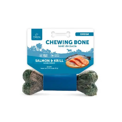 Pokusa Chewing Bone Omega to przysmak dla psów w formie kości do żucia. Jest to doskonała propozycja dla pupili, którym trzeba regularnie urozmaicać czas. Skład stanowią naturalne komponenty, które dodatkowo dostarczają wartości odżywczych do organizmu. W recepturze znajdziesz takie składniki jak skóra wołowa w ilości 88%, jak również skóra z łososia w ilości 10%. Poza tym receptura została uzupełniona o mączkę z kryla, która stanowi źródło kwasów Omega 3. Te z kolei świetnie wpływają na funkcjonowanie i rozwój mózgu, jak i całego układu nerwowego. Warto również dodać, że producent dodał do składu tej przekąski dla psów w formie gryzaka, małże nowozelandzkie, które to dostarczają do organizmu glukozaminy i chondroityny. Te dwa składniki dodatkowo wspierają funkcjonowanie aparatu ruchu. Poza tym w składzie gryzaka Pokusa Chewing Bone Omega znalazła się również spirulina.