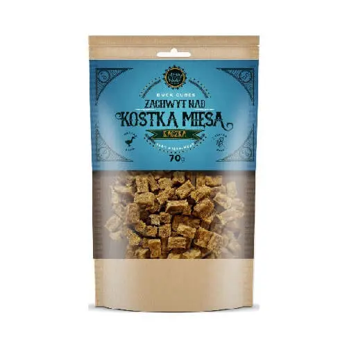 TrzyPsy Zachwyt nad Kostką Mięsa z Kaczki to kolejna propozycja w naszym rankingu na październik 2025 roku. Smaczki przyjmują postać niewielkich kawałków, które doskonale sprawdzą się do podawania jako nagrodę. Dodajmy, że jest to propozycja dla małych, średnich, jak i dużych psów. Skład oparty został na naturalnych składnikach! W recepturze znajduje się 100% mięsa z kaczki – to wszystko! Prezentowane smaczki, dzięki monoproteinowej formule, doskonale sprawdzą się dla psich alergików, jak również czworonogów z nietolerancją pokarmową. Warto wspomnieć, że przysmaki dla psa TrzyPsy nie zawierają w swoim składzie barwników, polepszaczy smaków oraz konserwantów. Jest to w 100% naturalny przysmak!