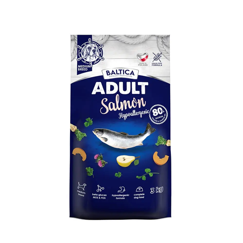 Kolejne miejsce w naszym rankingu zajmuje karma sucha Baltica łososiem, która doskonale sprawdzi się w przypadku psów wszystkich ras. Dostępna jest w kilku wariantach – dla psów małych, średnich, jak i dużych. W swoim składzie zawiera 45,5% mięsa z łososia, ziemniaki, jak również olej z łososia. Poza tym receptura została wzbogacona o ostropest plamisty, dynię, pulpę buraczaną, jak również drożdże browarnicze, które doskonale wspierają odporność psa. Co więcej, sucha karma dla psa Baltica z łososiem posiada również glukozaminę oraz chondroitynę, które zapewniają prawidłowe funkcjonowanie układu kostno-stawowego. Na dodatek karma ma w swojej formule ziele czystka, które wspiera odporność, jak również chroni psa przed pasożytami zewnętrznymi (kleszczami). Taka kompozycja składników przyczynia się do zapewnienia zdrowej diety dla psa, która przyczynia się do prawidłowego funkcjonowania organizmu. Wartość procentowa wapnia wynosi 1,2%, fosforu 1%, z kolei wartość energetyczna to 3840 kcal/kg.